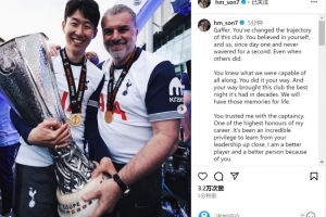 孙兴慜社媒晒出手捧奖杯与波斯特科格鲁的合照,配文:“教练,你改变了这家俱乐部的发展轨迹。从第一天起你就相信自己,也相信我们,从未动摇片刻,即使其他人有所怀疑。你一直知道我们具备的潜力。你以自己的方式行事,为俱乐部带来了几十年来最辉煌的夜晚,这些记忆将伴随我们一生。”