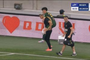 第67分钟,王钰栋在比赛中受伤被担架抬出场。王钰栋的这次受伤并非是在对抗中产生的,而是自己崴到了脚,被抬出球场的时候左膝位置进行了简单的包扎和冰敷。