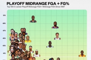 体育资讯8月27日讯 今日,数据媒体NBA University晒出一张自从1997年以来联盟季后赛中距离投篮出手次数前100球员的命中率分布图。