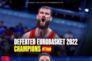 如此一来,格鲁吉亚本届欧锦赛已经先后击败上届欧锦赛的冠军和亚军。小组赛格鲁吉亚83比69击败西班牙,这场比赛也让他们在相互交手战绩上占优,最终他们和西班牙都是2胜3负,凭借交手战绩优势,他们拿到小组第4出线,西班牙则小组出局。