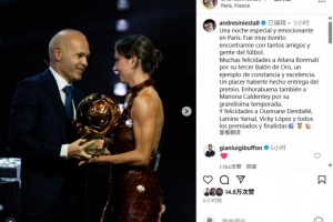 体育资讯9月25日讯 巴萨传奇伊涅斯塔出席金球典礼为女足金球奖颁奖,今日他更新社媒为所有获奖者和提名者送上祝贺。