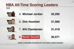 杜兰特在NBA职业生涯总得分榜上排名第八(30571),若按照上赛季场均得分(26.6分),只需要65场比赛,他将超越迈克尔-乔丹(32292)。