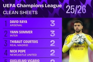 本赛季欧冠零封榜:拉亚、索默3场最多,库尔图瓦、维卡里奥2场