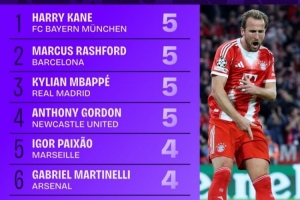 本赛季欧冠参与进球榜:凯恩、拉什福德、姆巴佩等4人均5球