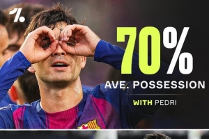 Onefootball统计了佩德里本赛季在场和缺阵时巴萨的控球率。佩德里本赛季出场时巴萨平均控球率70%,他缺席时巴萨平均控球率为50%,降低20%。
